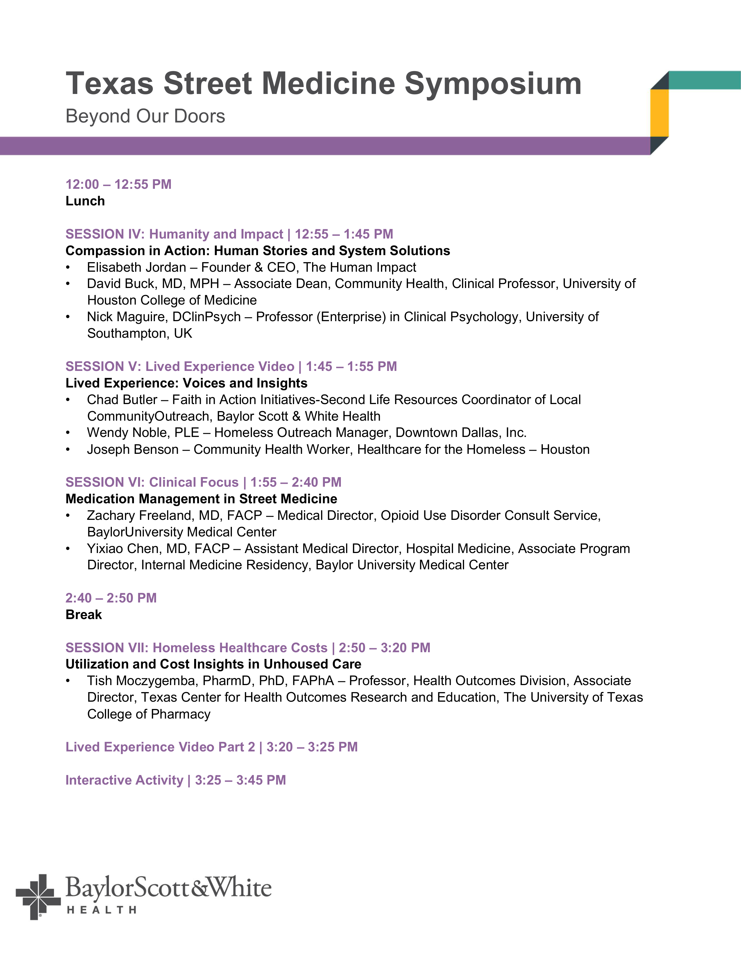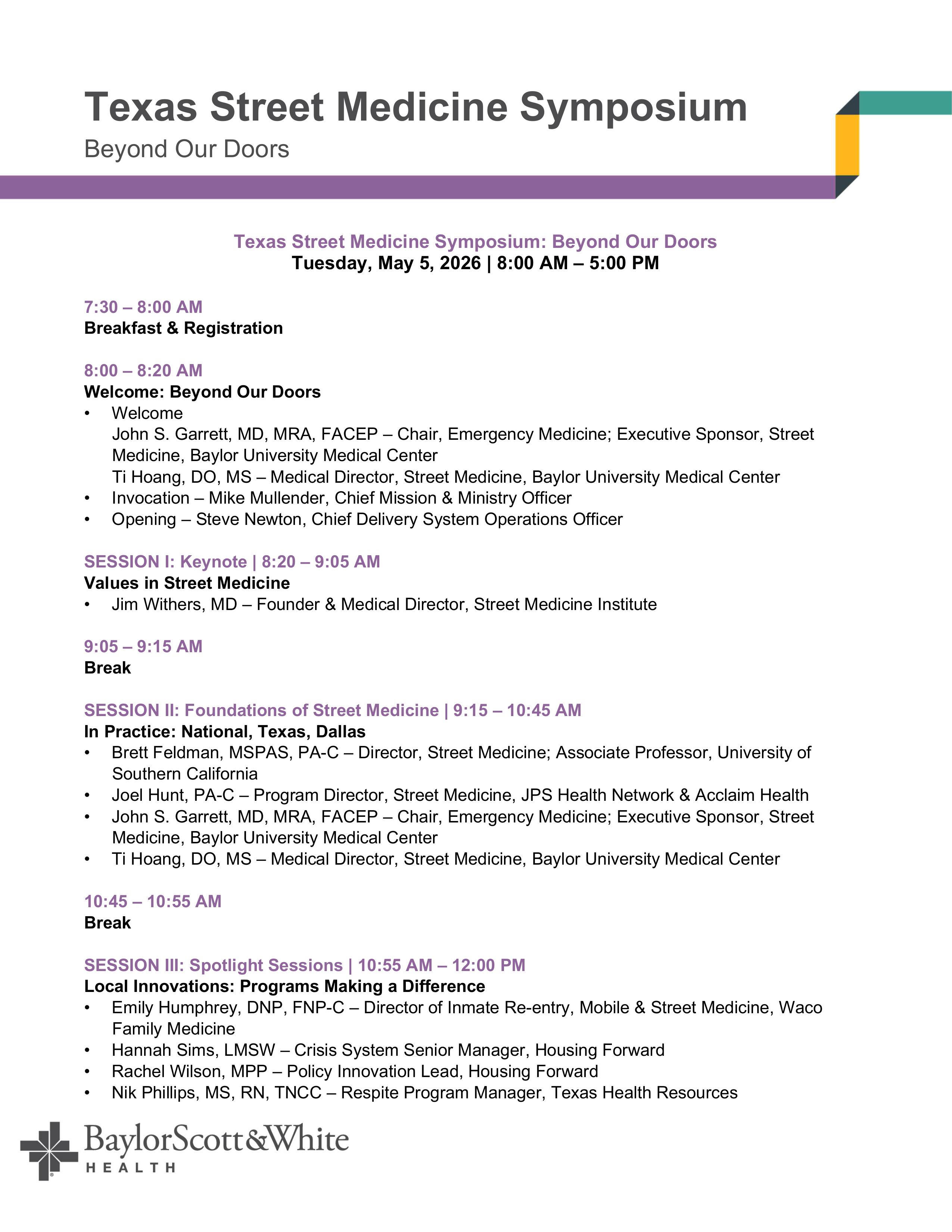 The 5th Annual 2026 Texas Street Medicine Symposium brings together healthcare leaders, street medicine practitioners, community partners, and policymakers from across Texas to advance innovative, compassionate care for individuals experiencing homelessness. Hosted for the first time in Dallas by Baylor Scott & White Health, this statewide gathering highlights best practices, emerging research, and real‑world solutions shaping the future of street medicine. Through keynote presentations, lived‑experience insights, and cross‑sector collaboration, attendees will explore how communities can expand access, strengthen partnerships, and deliver care that extends beyond our doors.